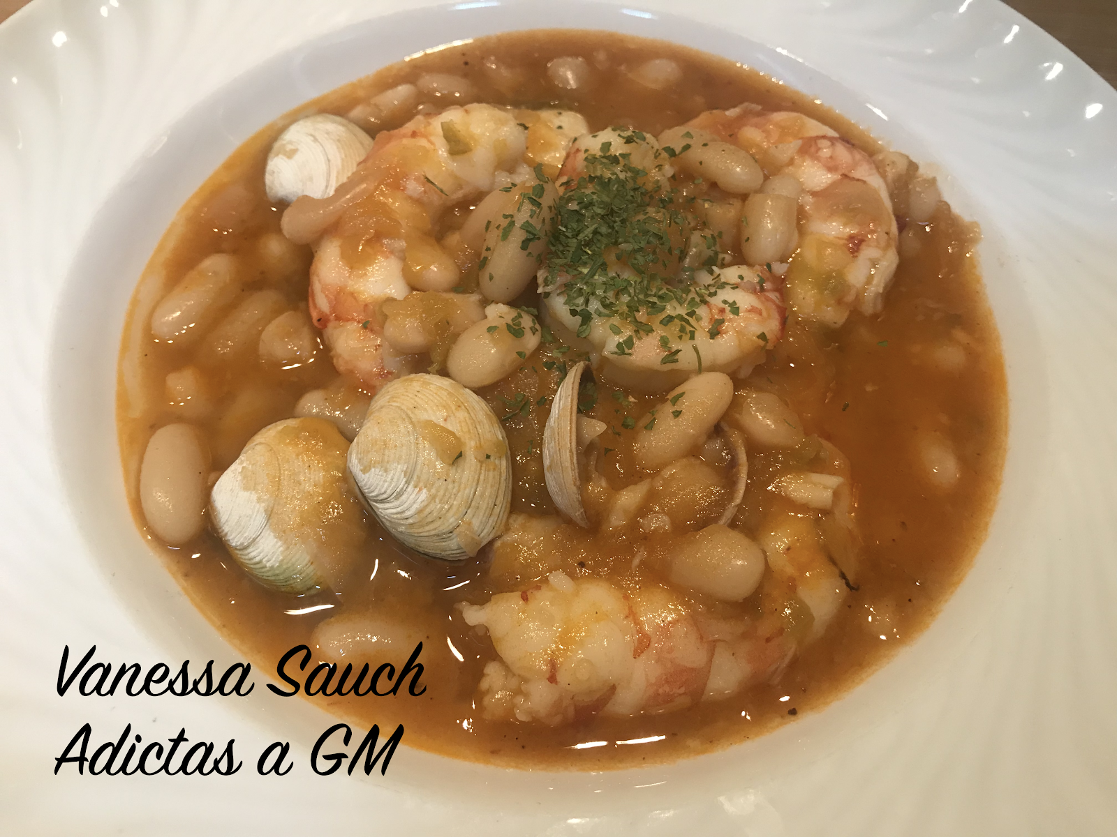 Podemos sofreir o ponerlo directamente todo dentro, añadimos cebolla, tomate, ajos, alubias el caldo y resto ingredientes menos las gambas y las almejas. 20 min turbo 160º
